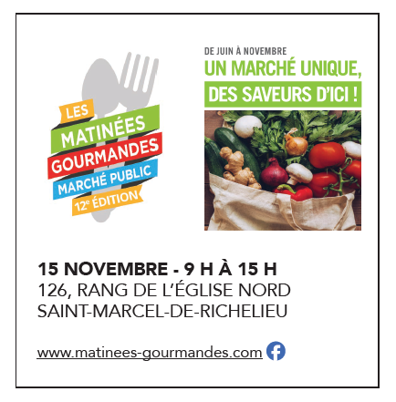 Participez à la dernière Matinée gourmande de l'année 2025. Cette année encore, vous y ferez la rencontre de plusieurs producteurs et transformateurs de la région en plus de faire de savoureuses dégustations, le tout dans une ambiance festive pour toute la famille.