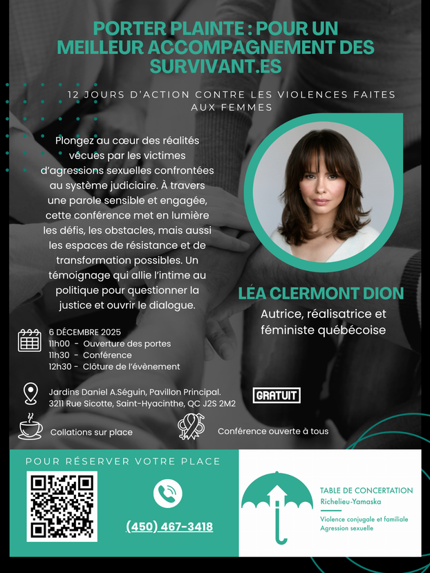 Dans le cadre des 12 jours d'action contre les violences faites aux femmes, la Table de concertation Richelieu-Yamaska en violence conjugale, familiale et violences sexuelles vous invite à plonger au coeur des réalités vécues par les victimes d'agressions sexuelles confrontées au système judiciaire.