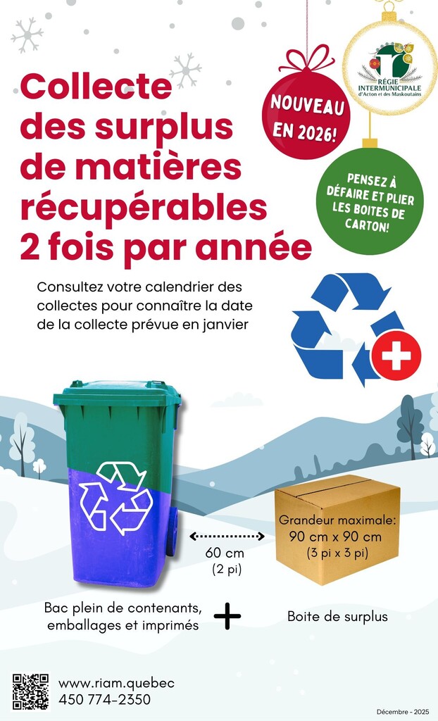 Nouveauté 2026 : Les surplus de matières récupérables seront collectés 2 fois par année. Une première fois suivant la période des Fêtes et une seconde fois suivant la période des déménagements. Consultez votre calendrier des collectes pour connaître les dates précises de ces collectes.