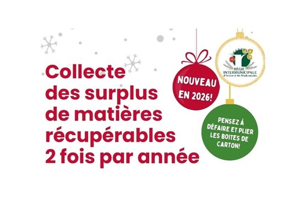 Nouveauté 2026 : Les surplus de matières récupérables seront collectés 2 fois par année. Une première fois suivant la période des Fêtes et une seconde fois suivant la période des déménagements. Consultez votre calendrier des collectes pour connaître les dates précises de ces collectes.