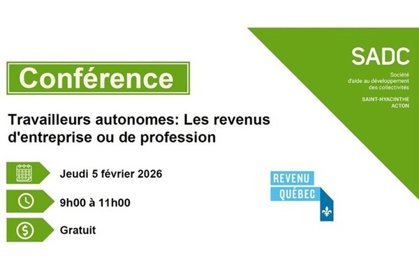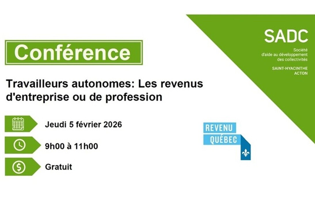 Cette présentation est offerte gratuitement par Revenu Québec et elle s'adresse aux travailleurs autonomes des MRC d'Acton et des Maskoutains. Elle a pour but de vous renseigner sur les différentes mesures fiscales relatives au démarrage et à l'exploitation d'une entreprise à propriétaire unique (travailleur autonome).