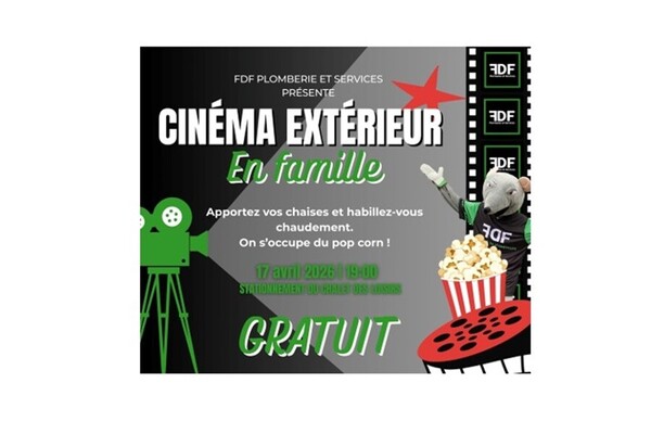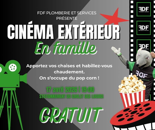 FDF Plomberie et Services inc. est fier de présenter la toute première édition du Cinéma extérieur en famille, le 17 avril* à 19 h, au stationnement du Chalet des loisirs à