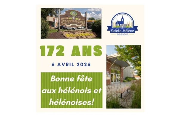 Le 6 avril 2026, la Municipalité de Sainte-Hélène-de-Bagot aura 172 ans. Les élus et employés municipaux souhaitent à chaque hélénois et hélénoise un bon anniversaire. Soyons fiers de notre chez-nous.